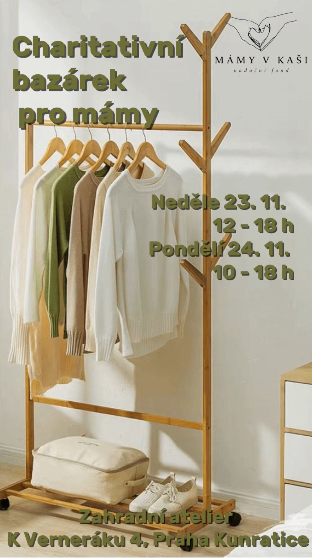 Milé maminky, sousedky, kamarádky. Srdečně vás zveme do Kunratic na sousedský "dámský bazárek". Přijďte si udělat radost holčičí parádou za miniceny a my pak díky vám zpříjemníme vánoce dětem z naší nadace. V neděli 23.11. nebo v pondělí 24.11., v zahradním atelieru v ulici K Verneráku 4, v Kunraticích.